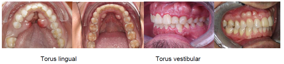 Los torus maxilares y mandibulares son formaciones óseas benignas que se encuentran en la cavidad oral, específicamente en la región de los arcos dentales. Estas estructuras, que pueden presentarse de manera unilateral o bilateral, están compuestas por tejido óseo esponjoso y cortical, y su tamaño y forma pueden variar considerablemente entre individuos, constituyendo una variabilidad anatómica de