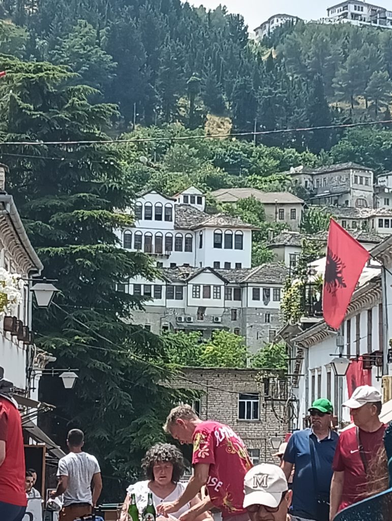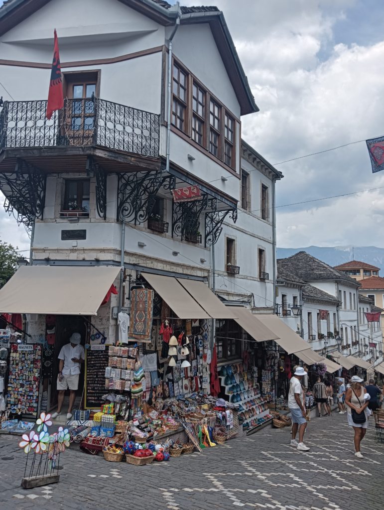 17 de junio de 2025: Salimos de Berat con dirección a Gjirokastër. De camino, en una rotonda de la carretera, vemos un avión soviético de la II Guerra Mundial. Llegamos a esta ciudad de cuento con muchas cuestas y casas preciosas muy adornadas de aspecto bávaro, y todas ellas convertidas en tiendas de recuerdos y artesanía, o bien en cafés, bares y restaurantes. Muy turístico, aunque con estilo.